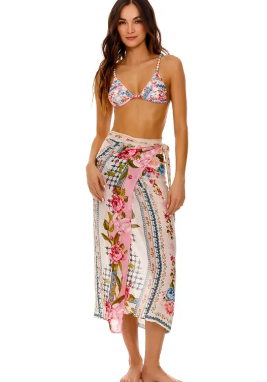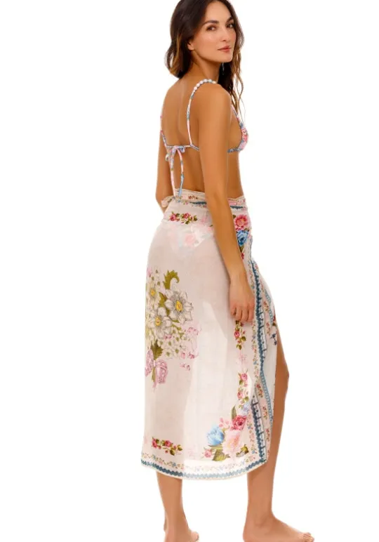 Effortlessly chic and versatile, the Zinna Pareo Meraki by beachwear designer Agua Bendita is a flowy cover-up adorned with vibrant floral prints. Layer it over your swimwear for light coverage while showcasing its delicate design. With a small hole for lace insertion, it can also be worn as a skirt for a stylish beach look.