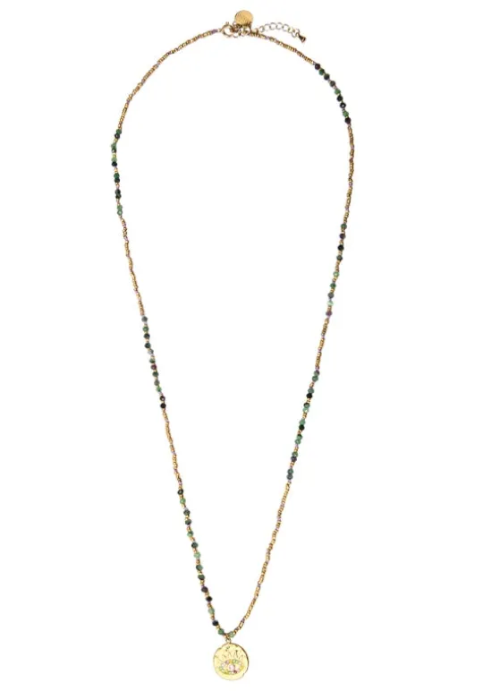 Add a pop of colour to your outfit with the Indira Necklace by jewellery designer Belle Mais Pas Que. These beaded green, purple, and gold necklace is the perfect way to accessorize and show off your unique style.