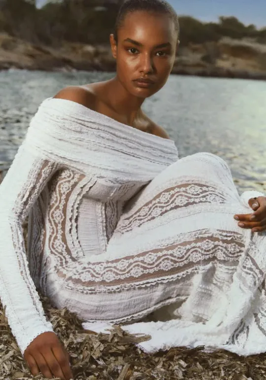 Unleash your inner beauty with the MINERVA long dress by resortwear designer Charo Ruiz in mesh fabric and cotton. The beach dresses delicate texture and sculpted fit flatters your body and highlights your curves. The versatile bardot neckline accentuates your shoulders and the long sleeves add an elegant touch.