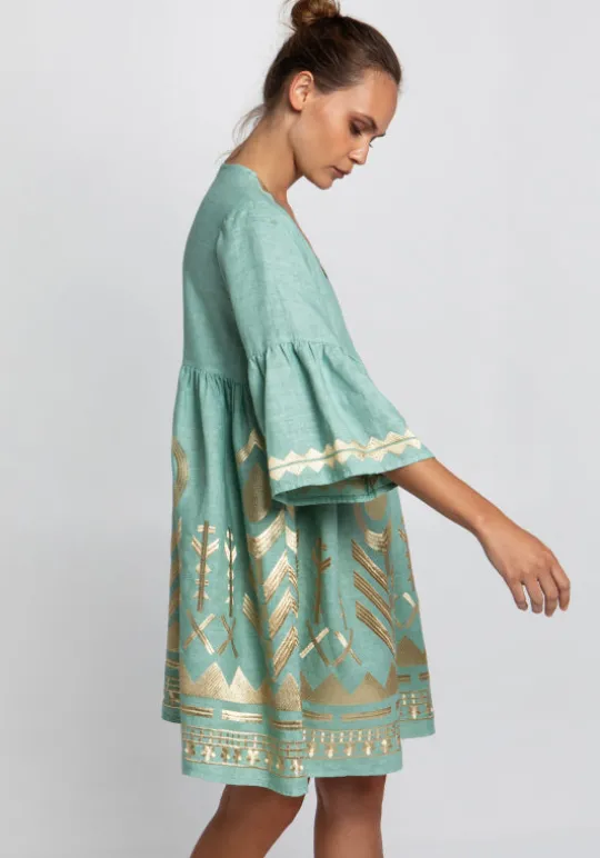 Look effortlessly chic this summer in the Flared Sleeve Feather Embroidered Dress by resortwear designer Greek Archaic Kori in Green and Gold. This loose fit summer dress features a low V neckline with flared mid length sleeves finished with a feather inspired gold embroidery detail. Perfect to take you from exploring the city straight to the beach.