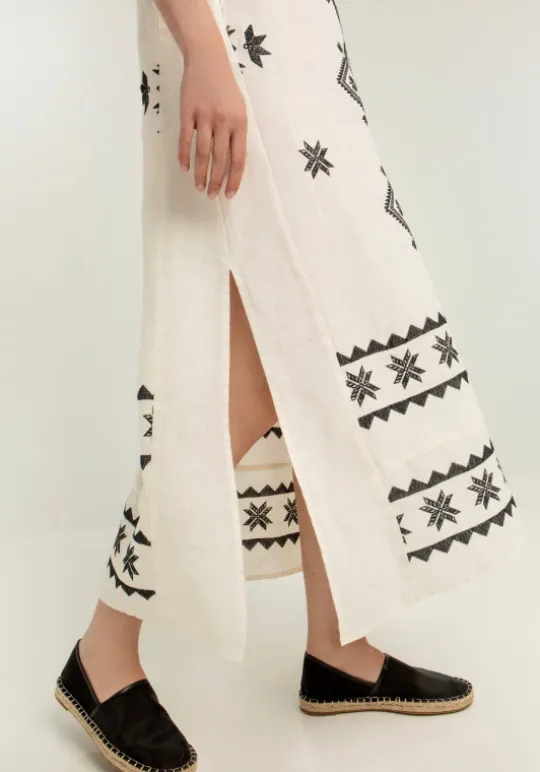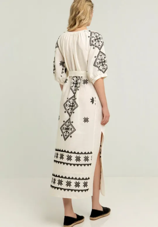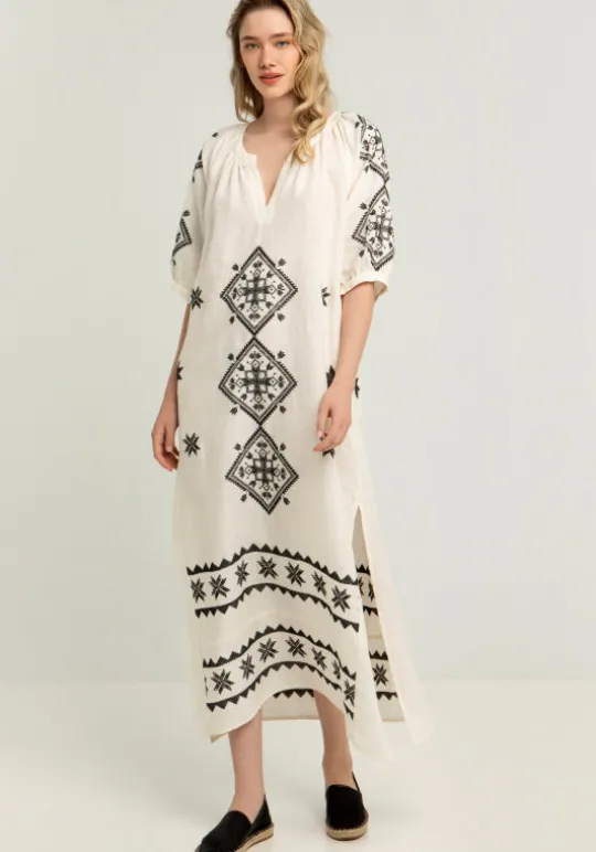 For an effortless summer look choose the Lefkada Belted Midi Dress with Black Embroidery by resortwear designer Greek Archaic Kori. This kaftan like dress features a small v neck line with mid length puff sleeve offering a covered up look but still breathable and perfect for the summer heat. Beautifully decorated with lefkada inspired black embroidery.