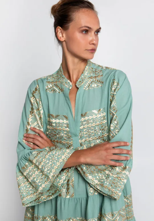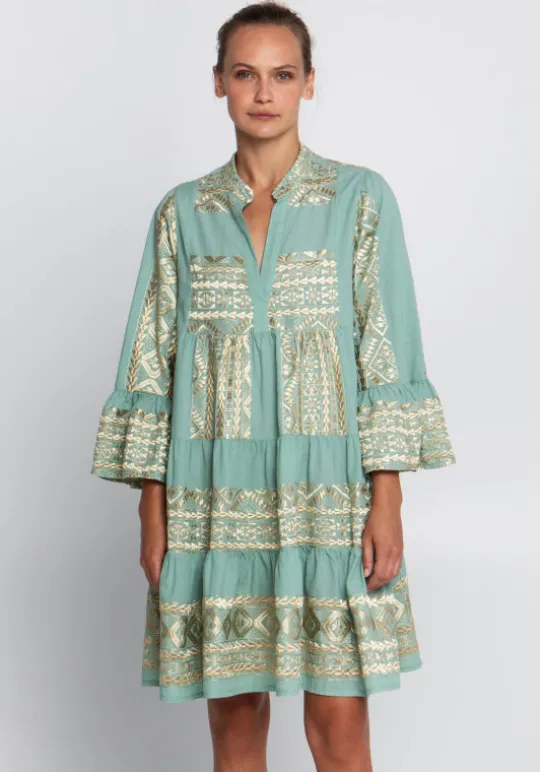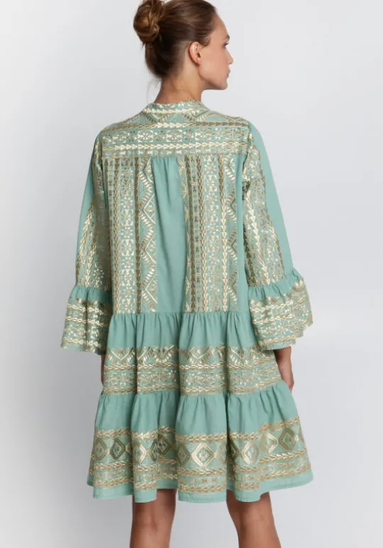 Turn heads in the stunning Mini Dress with Triangle Embroidery by resortwear designer Greek Archaic Kori. This beautiful mini dress in green cotton with gold embroidered, features a v neckline with long flared sleeves and a tiered skirt.