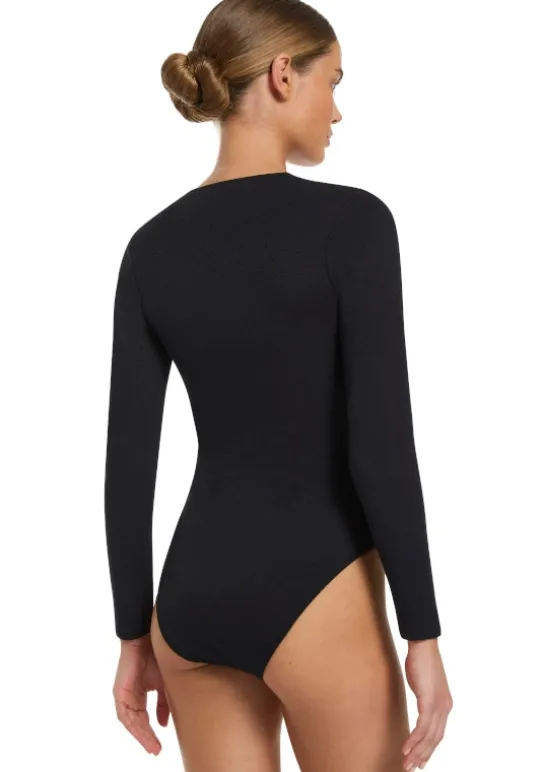 The Joali Long Sleeve swimsuit by swimwear designer Jets balances sophistication and allure. Featuring a plunge neckline with adjustable lacing, long sleeves and a high legline.