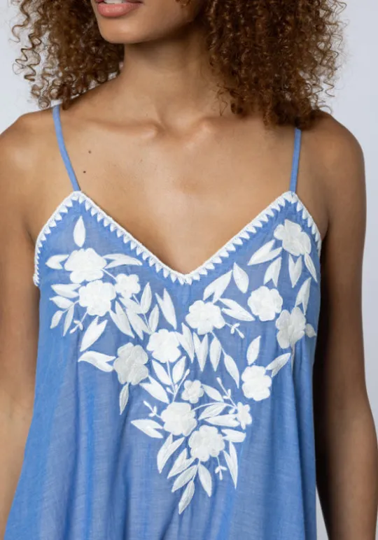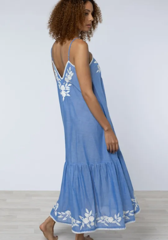 Look effortlessly chic in the embroidery V Neck Midi Dress in Denim by beachwear designer Juliet Dunn. In a with floral embroidery, this relaxed fit midi dress features spaghetti straps and a v neckline. 100% cotton