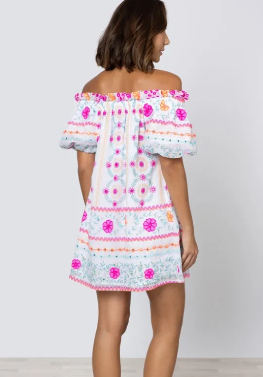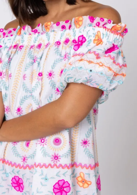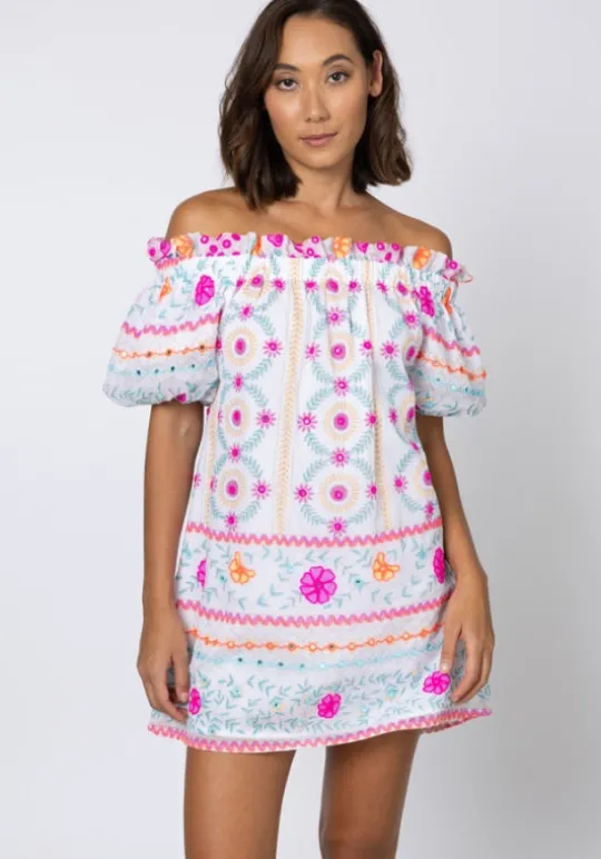 Get ready to turn heads in the Mexican Embroidered Mini Off Shoulder Dress in Whiteby resortwear designer Juliet Dunn! This stunning dress features a unique mexican embroidery that adds a touch of edginess to the classic boho style. Made with high-quality materials, this beach dress is both comfortable and stylish. Featuring an off the shoulder neckline and short puff sleeves.