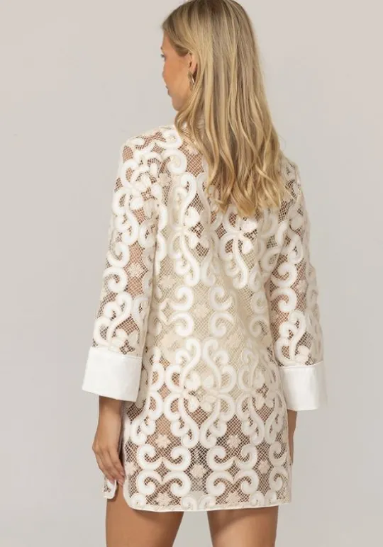 Crochet, this seasons summer essential! The Chandra Kaftan in white by resortwear designer Miss June will be your new go to mini dress, featuring long sleeves and a v neckline with embroidered details, comfortable and perfect for a beach to beach bar boho vibe. It’s a versatile and stylish piece that you’ll love wearing all summer long. Available in one size fits most from size UK 8 – 14