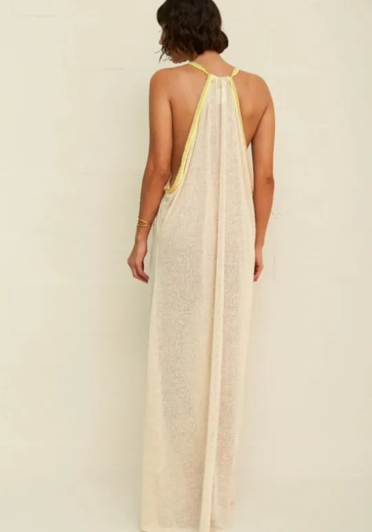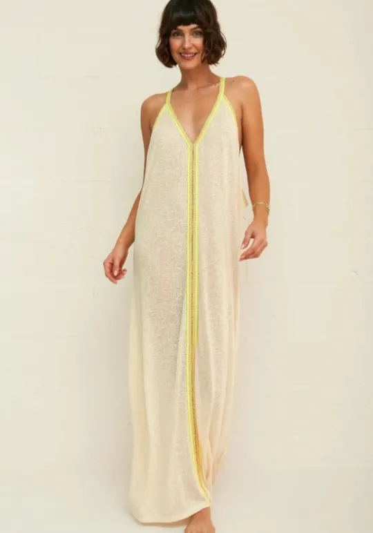 Make a style statement in the gorgeous Inca Sun Dress in Ecru by beachwear designer Pitusa. Made from soft semi sheer jersey, it has a beautiful embroidered panel round the neckline and middle of dress giving it a pop of colour. Available in one size (fits 8-14) in 3 lengths Petite and Standard. Length: Standard 54.2in / 139cm | Petite 53.2in /136cm from shoulder.
