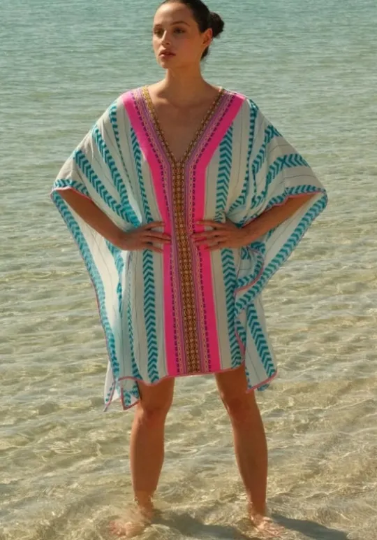 Look effortlessly chic in the Mini Thobe in Light Blue by resortwear designer Pitusa. Featuring a deep V neckline with Inca trim detailing and relaxed flutter sleeves. The relaxed poncho style features a chic striped print with pink finishing, the perfect poolside cover up. Available in one size fits 8-14, in two different lengths Petite or Standard.