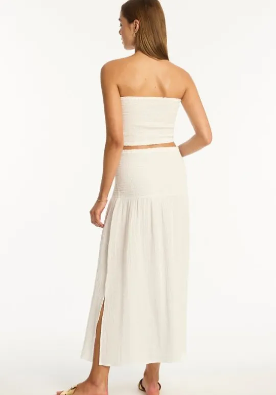The Sunset Beach Bandeau Top in white by swimwear designer Sea Level. The beach bandeau features a fully shirred top and makes for a chic holiday go to. Pair with the matching sunset beach skirt in white.