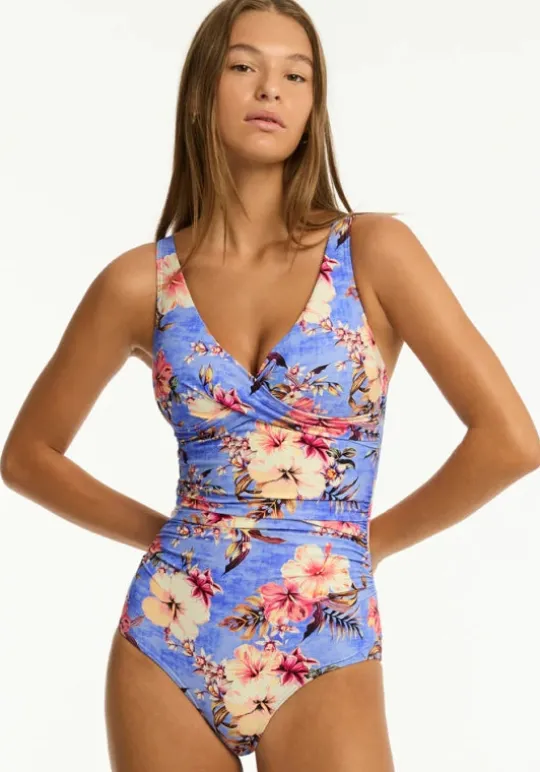 Look effortlessly chic in the Twist Front Swimsuit in blue hawaii by swimwear designer Sea Level. This flattering swimsuit features a v neckline with cross front detailing, along with soft padding and adjustable straps for shape and support.