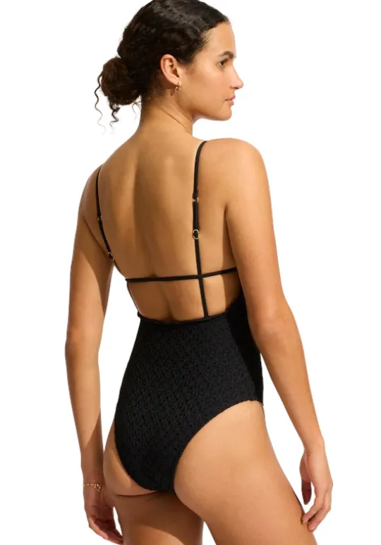 Look chic in the Daydreamer V Neck Swimsuit in Black by swimwear designer Seafolly. In feminine broderie anglaise, this flattering v neck swimsuit features ruffle trim, with optional padding, shelf bra and adjustable straps to create the perfect fit.