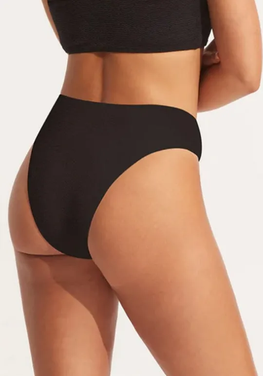 Look effortlessly chic the SeaDive One Shoulder Bikini in Black by beachwear designer Seafolly. In a classic black, the pull on one shoulder top is made of soft ruched fabric with optional cups for shape and support. The wide side retro bottoms offer fuller coverage.
