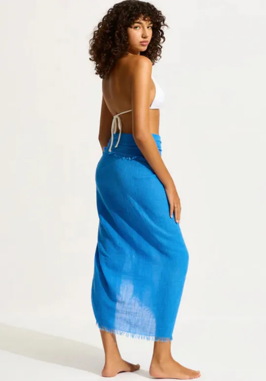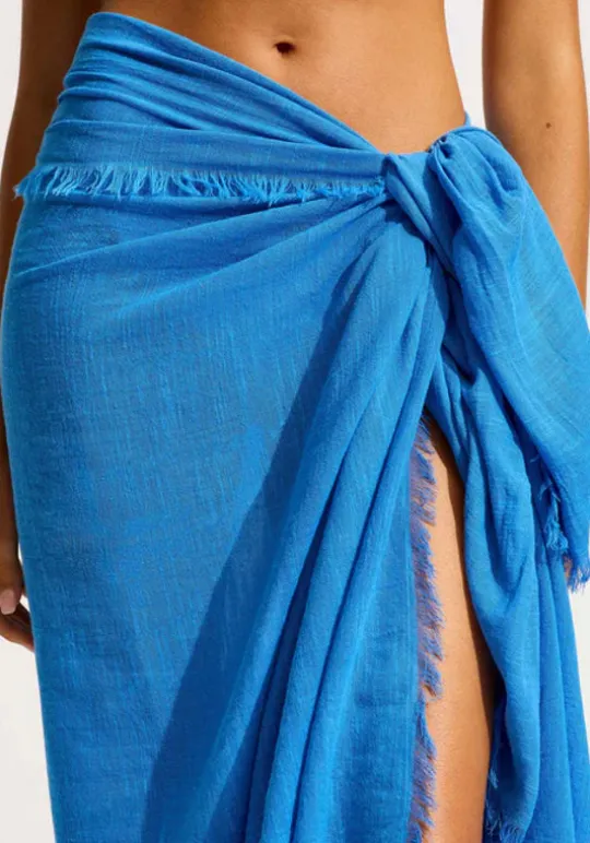 The Textured Cotton Beach Wrap in Azure Blue by beachwear designer Seafolly is the perfect wear-anywhere cover up for beachside, poolside and beyond. A perfect piece to layer over your favourite swim.