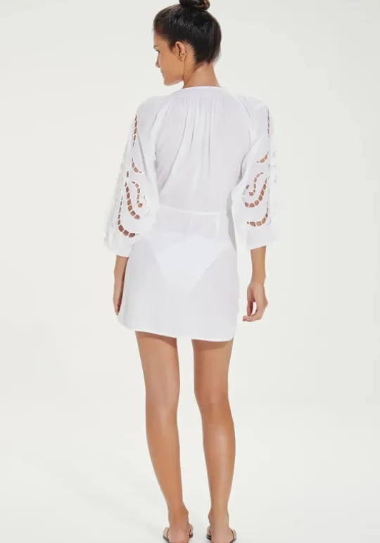 Turn heads in the bestselling Alice Chemise in White by beachwear designer Vix. The mini cover up features a deep V neckline, with cropped lace detailed sleeves and a statement front tie. The Alice is a must have addition to your vacation wardrobe.