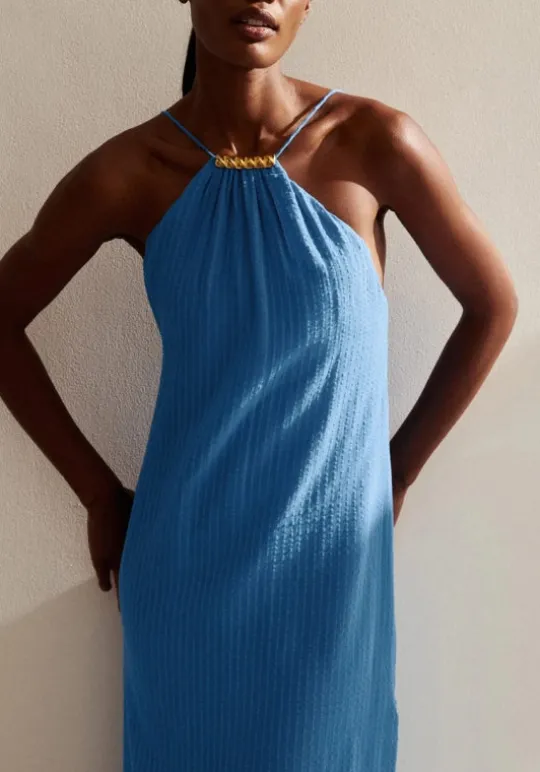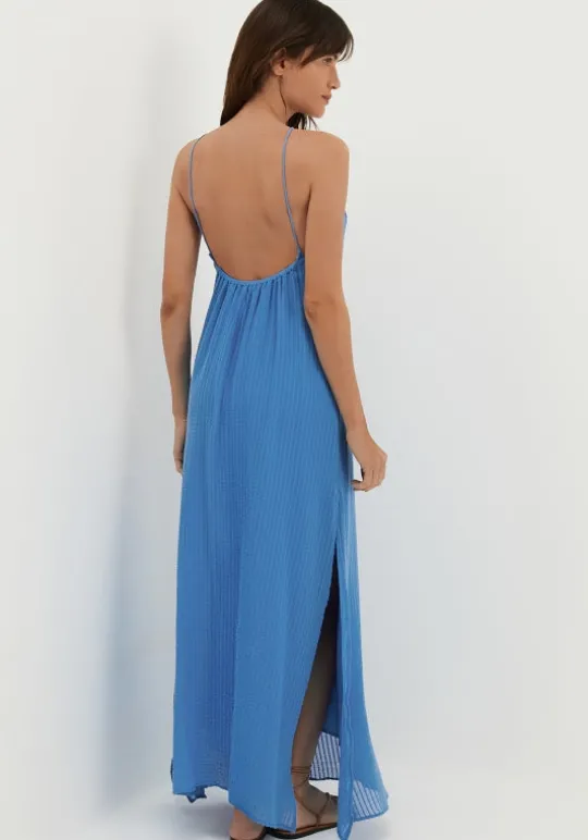 Elevate your beach style with the ViX Lily Long Dress in Beach Front. Its lightweight striped cotton fabric offers all-day comfort while the open back and side slits add elegance and movement. Complete the resort-ready look with sandals and ViX accessories.