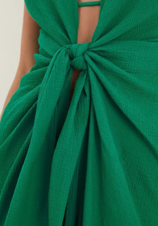 Turn up the glamour in the gorgeous Mita Long Cover Up in Reflection by beachwear designer Vix. In a emerald green, this chic beach coverup features a deep v neckline with knot detail and sexy slit. Layer it over the matching Reflection Bia Bikini for an effortlessly chic beach look.”
