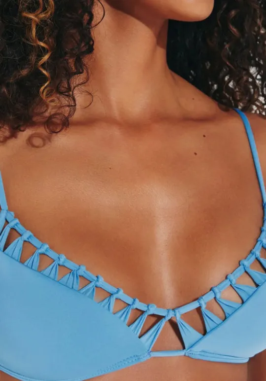 Make a statement in the Zen Leeza Bikini in Blue by swimwear designer Vix. The updated bralette style bikini features statement geometric cut outs and a macrame trim. With adjustable straps and removable padding to create the perfect fit. Complete the look with the matching zen leeza high waisted bottom.