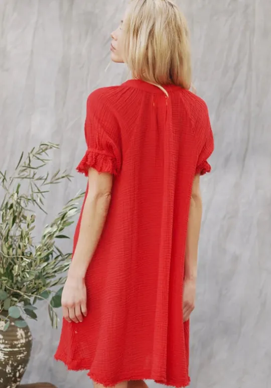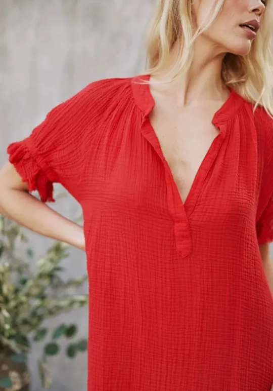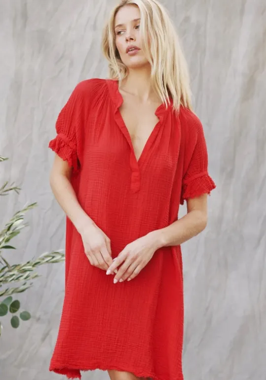 For an effortless look choose the Antibes Kaftan in Lipstick by beachwear designer 9Seed. Made from airy gauze cotton, this stylish kaftan dress features a v neckline with elasticated puff sleeves and a raw edge hem.
