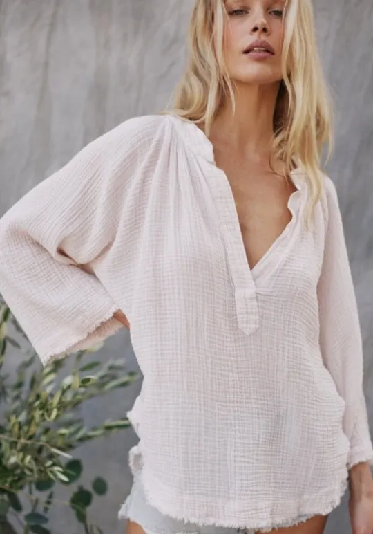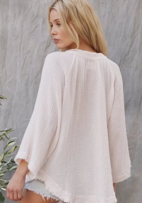 Look chic in the stylish Marrakesh Top in Kiss by beachwear designer 9Seed. Made from airy gauze cotton, this stylish beach top features a v neckline with mid length wide sleeves and a raw edge hem.