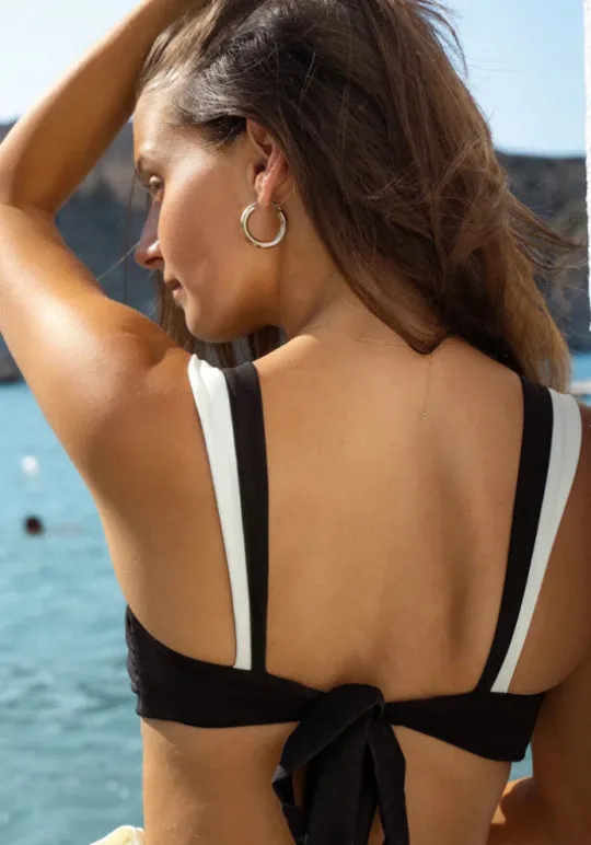 Turn heads in the beautiful Cannes Bikini in Black/Ivory by swimwear designer Away That Day. The flattering bralette bikini top features a sweetheart neckline with U bar detail in the centre, along with wide contrast straps and a tie back to create the perfect fit. The high waist bottoms features a hig legline and ivory tie at the waist.