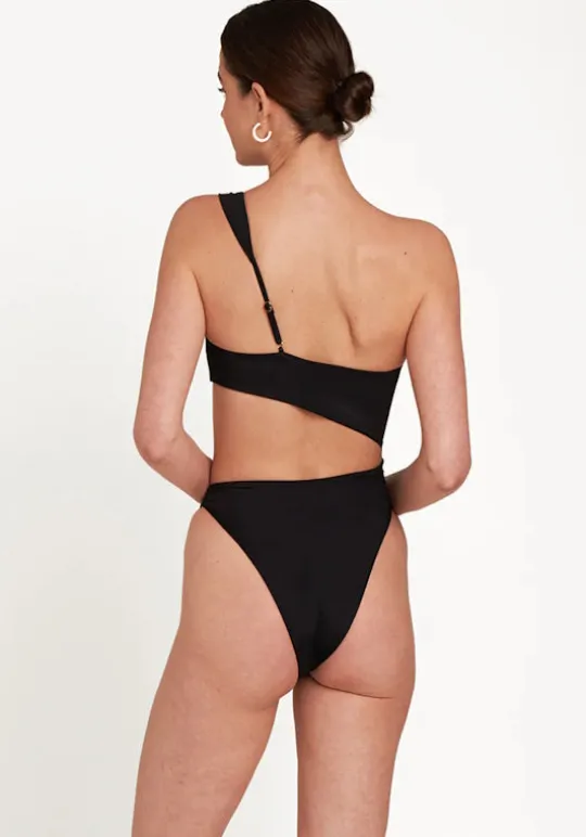 Turn up the glamour in the stunning Havana Swimsuit in black by swimwear designer Away That Day. This chic cut out swimsuit features a one shoulder top with adjustable strap, along with high legline and gold U bar detail at the side. Made from a soft stretchy fabric, and is double lined for extra support.