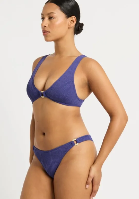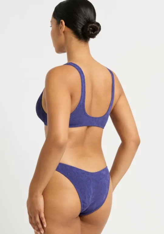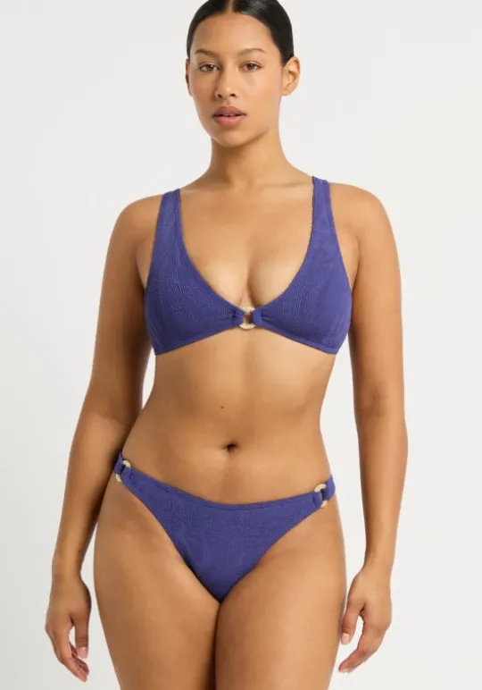 The Animalia Ring Scout bikini in navy by swimwear designer Bond Eye features their best-selling bikini top with a twist! Featuring a classic scoop neckline with a low scooped back finished with a ring recycled shell detailing. Matched with a cheeky coverage bottom. The perfect designer bikini made from stretchy crinkle fabric, available in one size fits 8-12 UK.