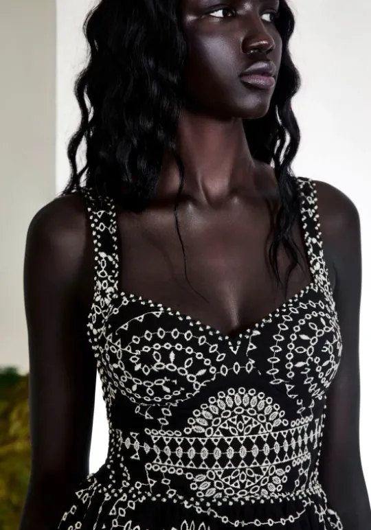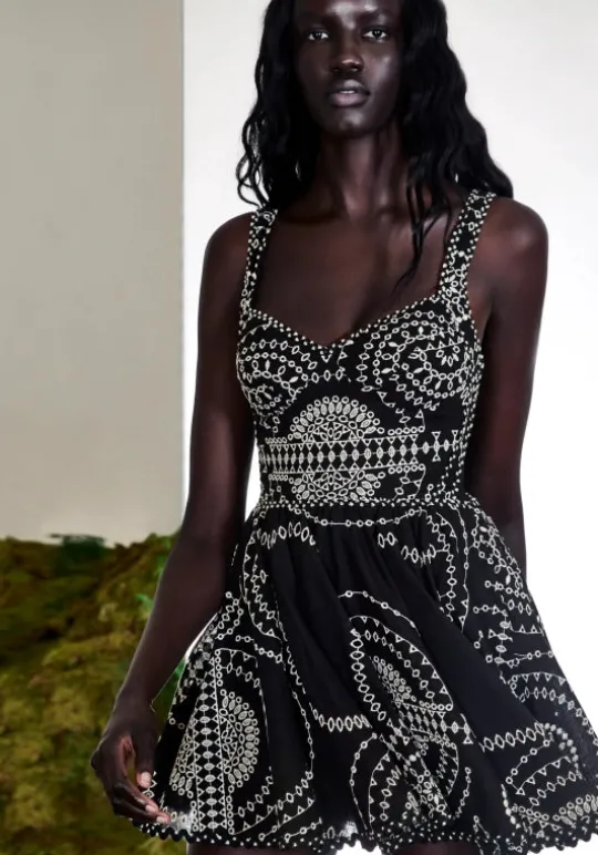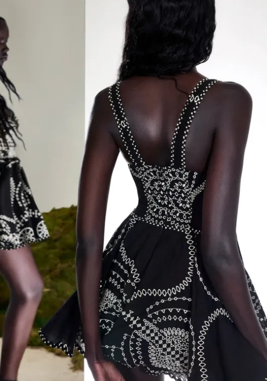 Introducing the Birdie Dress in Black Nelum by resortwear designer Charo Ruiz! Made with embroidered linen and cotton, this mini dress features a sweetheart neckline and A-line skirt with lattices for a feminine and elegant look. Perfect for any summer occasion, add it to your wardrobe.