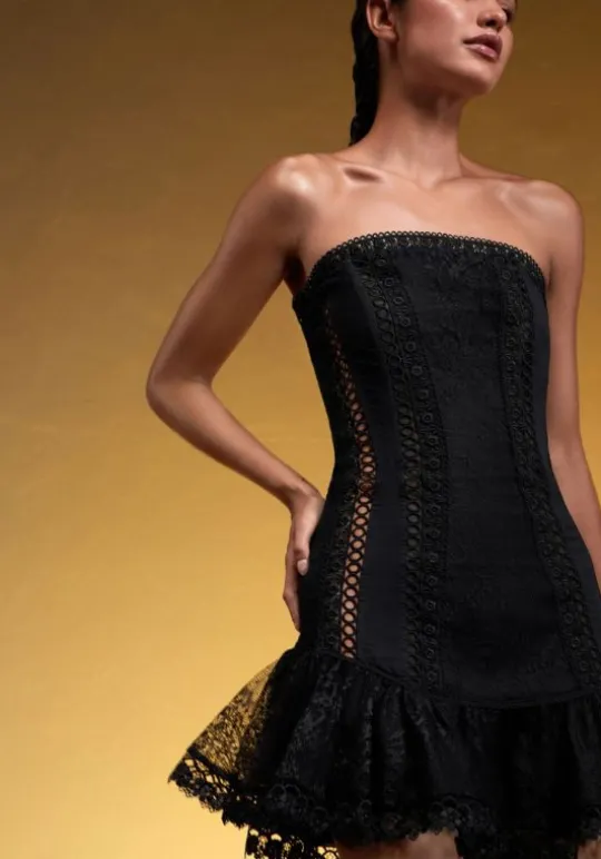 The beautiful Victoire dress by resort wear designer Charo Ruiz creates a stunning silhouette that flatters any body. The summer dress features a classic strapless neckline is lined with delicate guipure, and the skirt is finished with ruffled lace.Model is 1.79m tall and wears a size XS90% cotton | 10% polyester