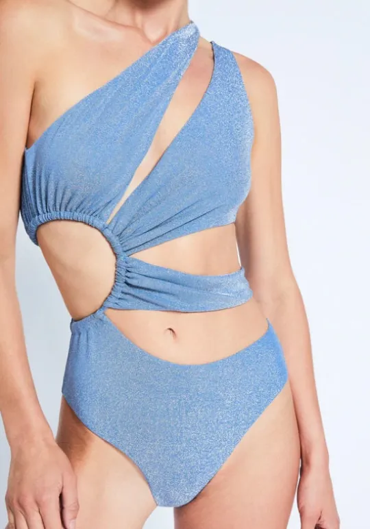 Make a style statement in the stunning Nadine Swimsuit in Azure by beachwear designer Devon Windsor. In blue shimmer fabric, this chic one shoulder swimsuit features cut-out detail throughout front and back, along with adjustable panels at the side.