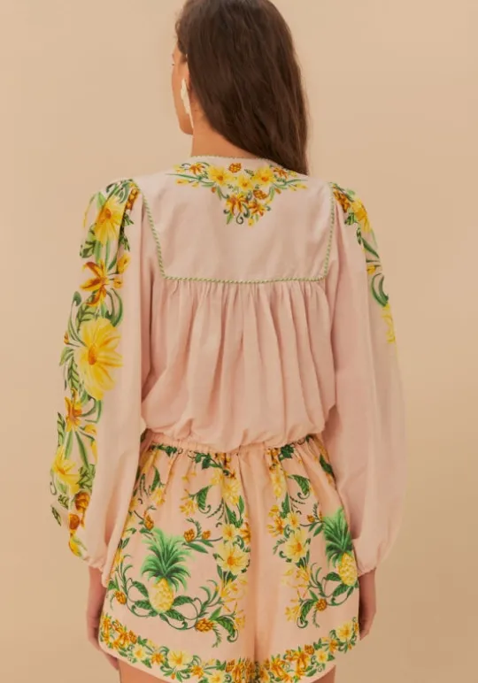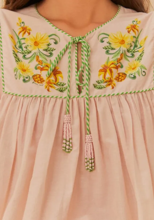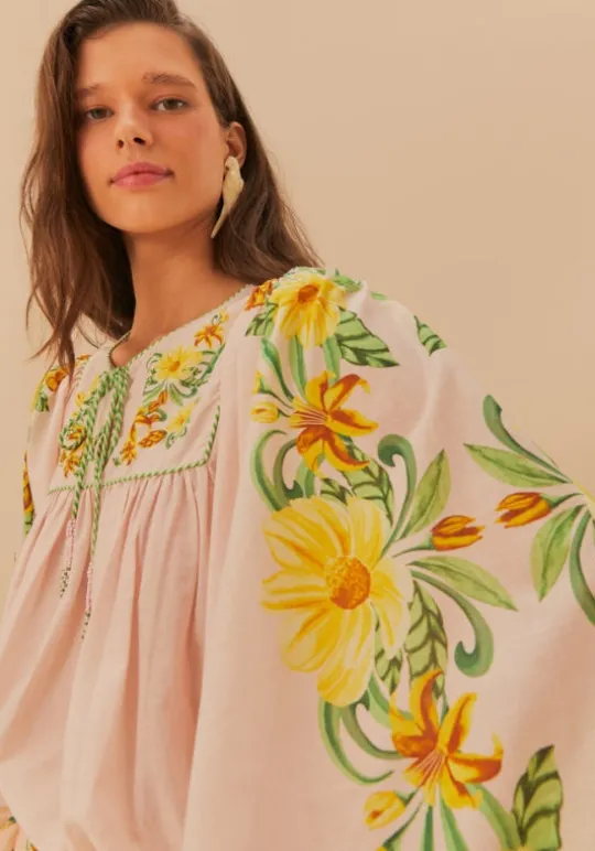 Effortlessly blend comfort and elegance with the Pink Botanical Beauty Long Sleeve Blouse. Adorned with vibrant floral patterns, this enchanting piece features billowy sleeves and playful embroidery for an artistic touch. Delicate green trims and flowing fabric create a soft silhouette, perfect for adding a touch of tropical whimsy to any wardrobe.