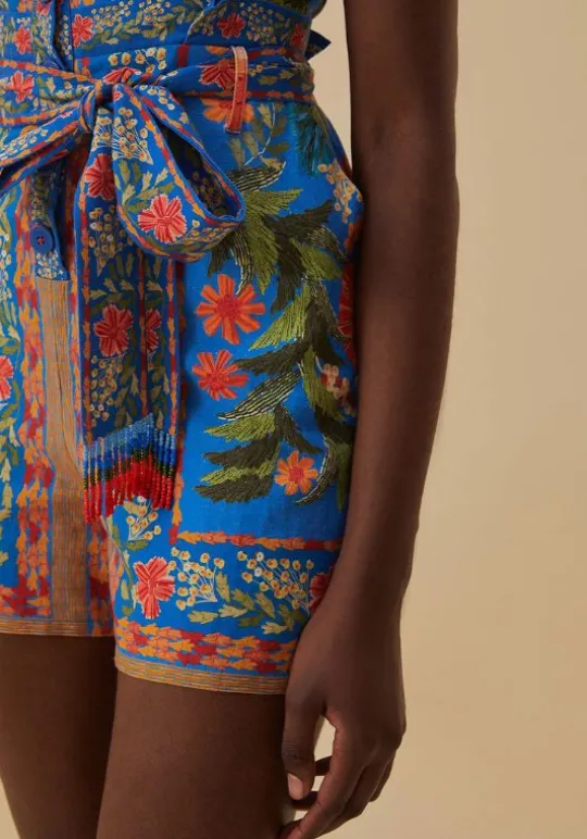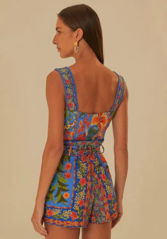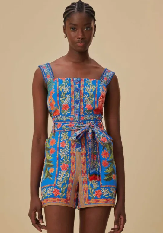 The Stiched Garden Blue Romper by Resortwear Designer Farm Rio effortlessly combines style and sustainability. This chic playsuit features a square neckline and a button down front. The perfect practical yet playful addition to your wardrobe.