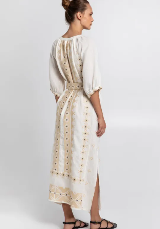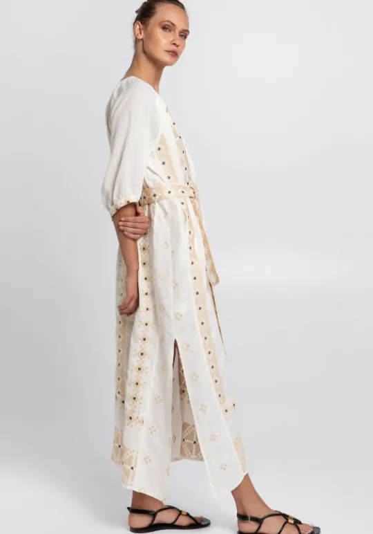 For an effortless summer look choose the White Pixel Belted Midi Kaftan with Gold and black Embroidery by resortwear designer Greek Archaic Kori. This kaftan like dress features a small v neck line with mid length puff sleeve offering a covered up look but still breathable and perfect for the summer heat. Beautifully decorated with pixel inspired gold and black embroidery.