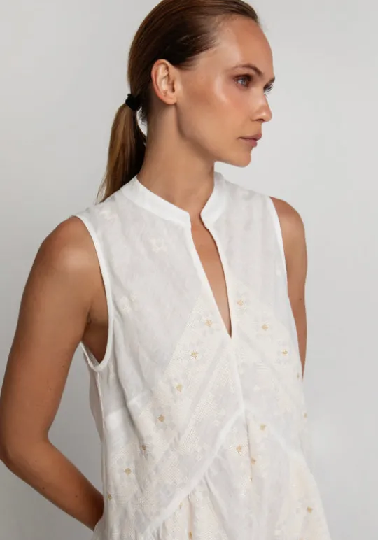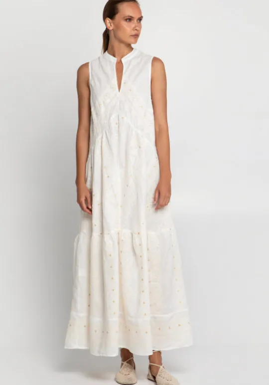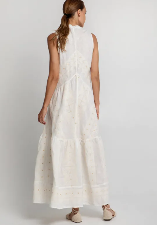 Look effortlessly chic in the Pixel Sleeveless Maxi Dress in White and Gold by Resortwear designer Greek Archaic Kori. This simple shape summer dress features a tired skirt with a v neck line and elevated with gold pixel embroidery detail. The perfect dress to take you from a walk around the city to the beach.