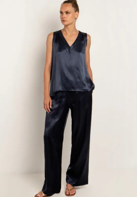 Look chic and sleek in the Silk Trousers in Navy by resortwear designer Green Archaic Kori. These lightweight trousers features a drawstring waistband and side pockets for a relaxed evening look. Pair with the co-ordinating Silky Tank.