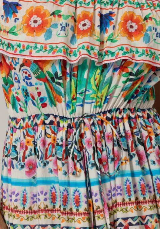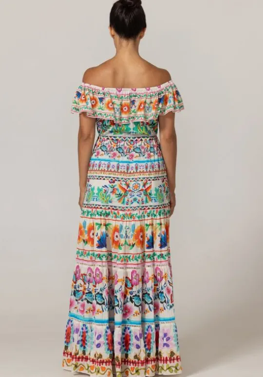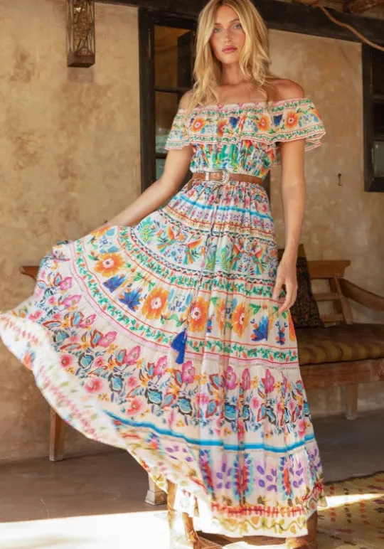 Make a style statement in the beautiful Yalla Dress by resortwear designer Miss June. In a vibrant print, this full length dress features an off the shoulder neckline with ruffle trim, a drawstring tie waist with tassel ties and a full tiered skirt. Available in one size fits UK 8-14.