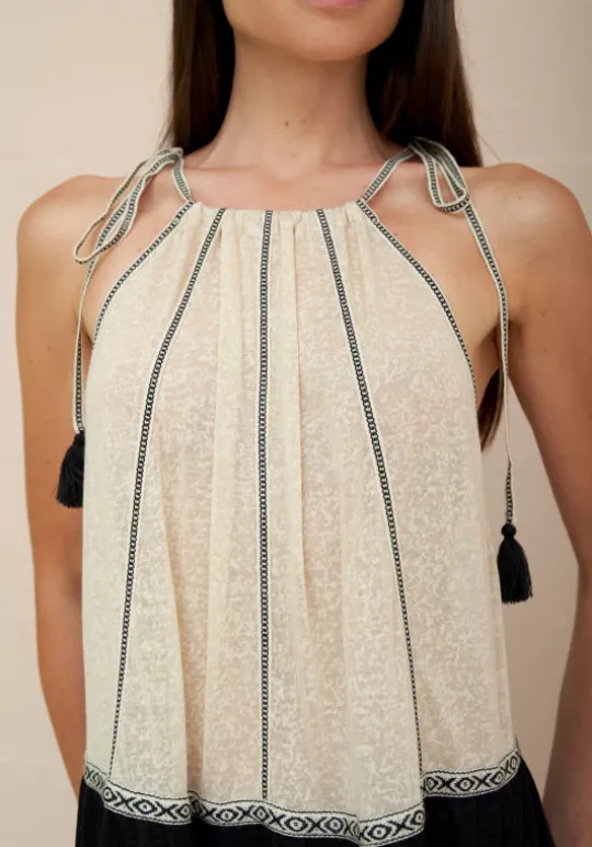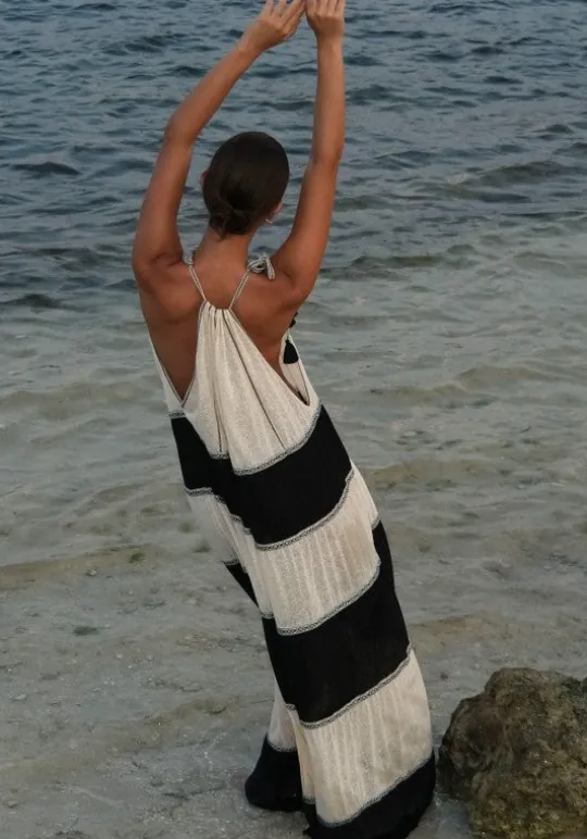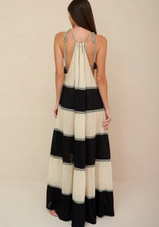 Upgrade your summer wardrobe with the Aegean Tiered Dress in Ecru by resortwear designer Pitusa. This maxi dress offers both comfort and style with its flowy tiered design, halter neck, and adjustable tassel straps. Perfect for warm occasions and days spent lounging by the beach or pool.
