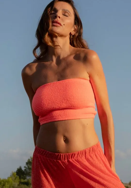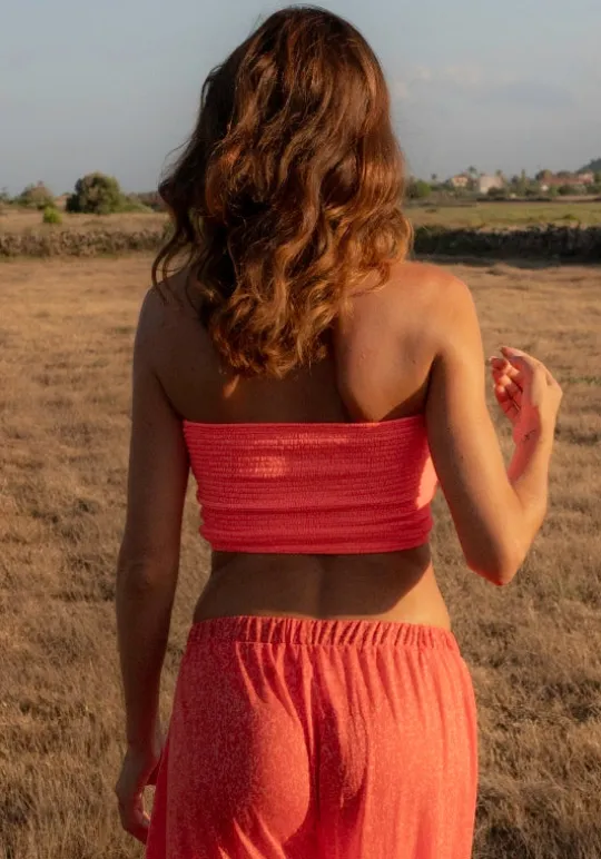 Elevate your summer wardrobe with the Smocked Bandeau Top by resortwear designer Pitusa in delicious strawberry. This versatile top pairs perfectly with the colour block palazzo pants for a stylish and comfortable outfit. The smocked design adds a touch of texture and the bandeau style keeps you feeling cool.