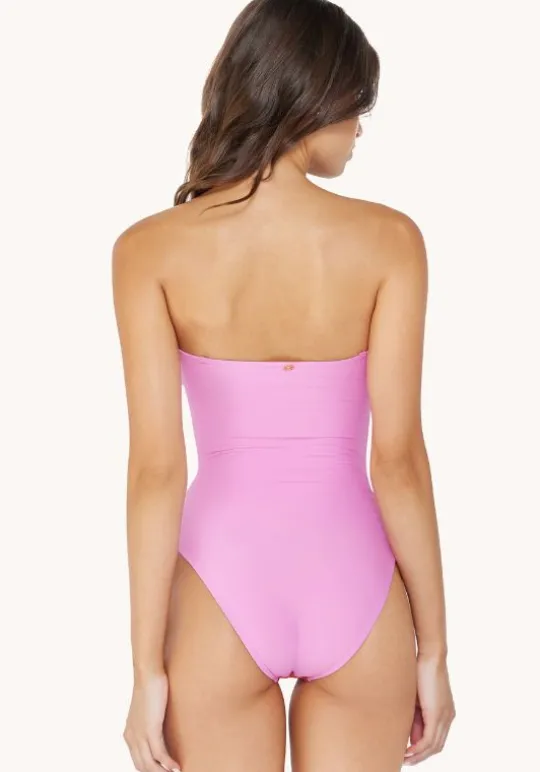 The Bandeau Swimsuit by PQ in Capri ads a spin to the classic bandeau one piece shape we all know and love. With intricate floral lace panels the pink bandeau swimsuit is elevated that offers medium coverage.
