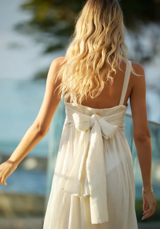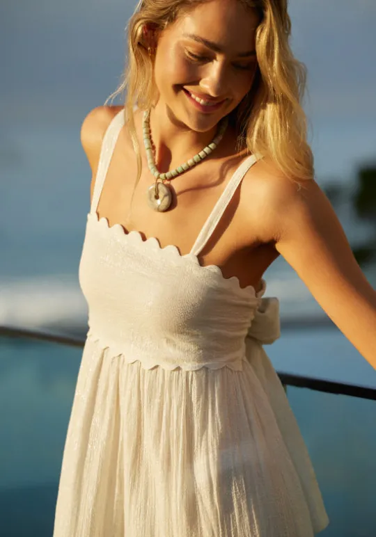Introducing the effortlessly elegant Emery Dress in Ivory by PQ Swim. This beach dress features a feminine ivory hue and a delicate scalloped hem at the neckline. A bow at the back adds a touch of charm, making it the perfect beach dress for any beach getaway.