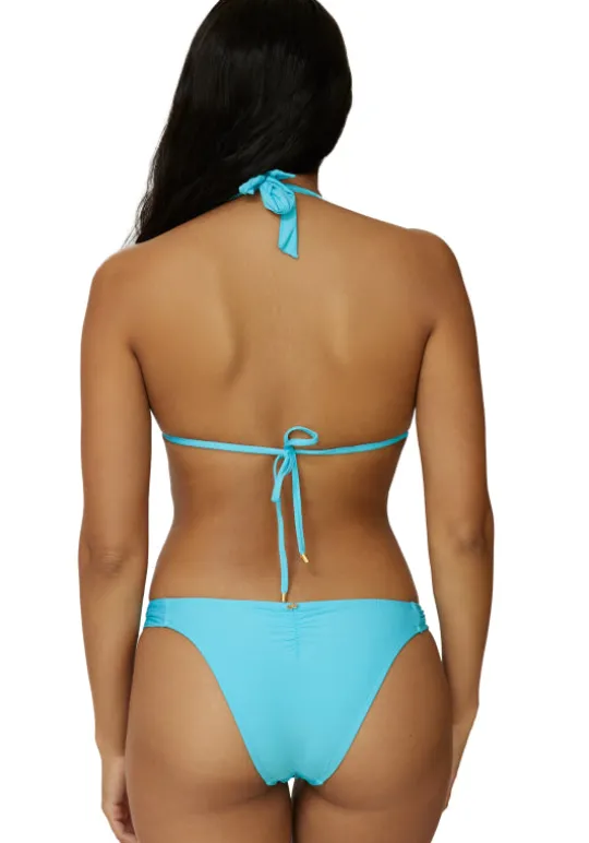 Turn up the glamour in the bold Kai Lace Triangle Bikini by beachwear designer PQ Swim. In a delicate pink lace, this sexy triangle top features a tie back and optional padding to create the perfect fit. The fanned bottoms have lace detail, chic ruched sides and are available with either skimpy Brazilian bottoms (br) or the full cut bottoms (full) which offer more coverage.