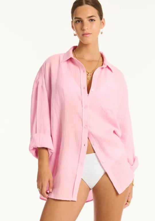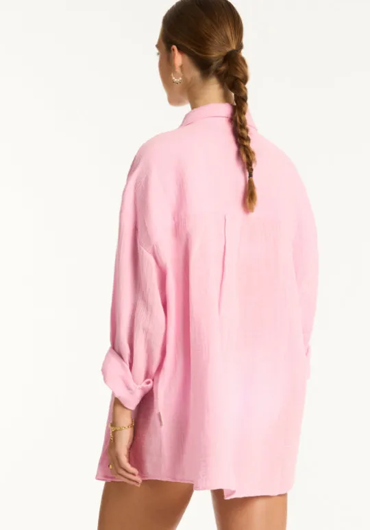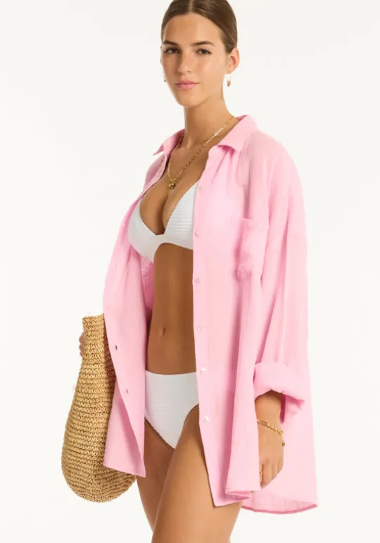 The Sunset Beach Shirt in baby pink by beachwear designer Sea Level will your new go to beach shirt. Featuring button detailing and roll up sleeves made with 100% cotton, this shirt is perfect for a hot city day as a well paired with your favourite bikini to complete your beach look.