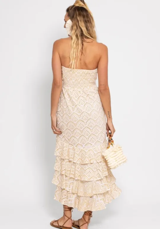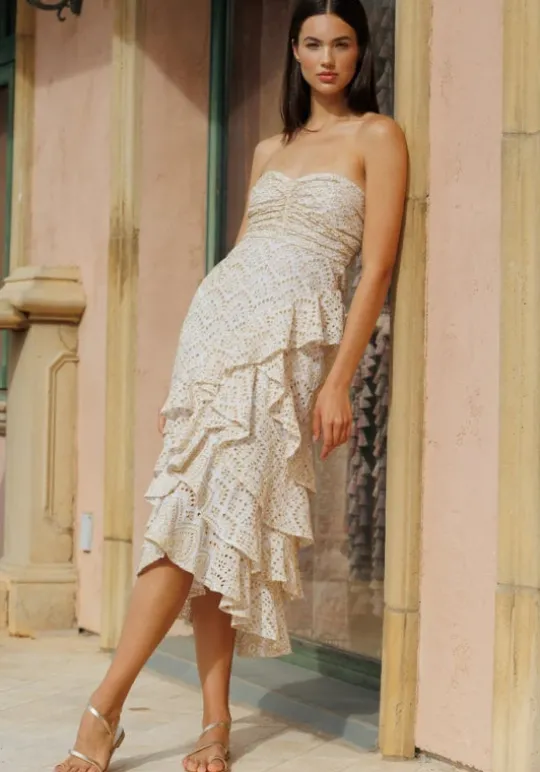 Make a style statement in the gorgeous Flavie Dress in white with gold embroidery by resortwear designer Sundress. In white and gold broderie anglaise, this fitted strapless summer dress features a tie detail at the front and a midi length skirt with asymmetric tiered ruffles.
