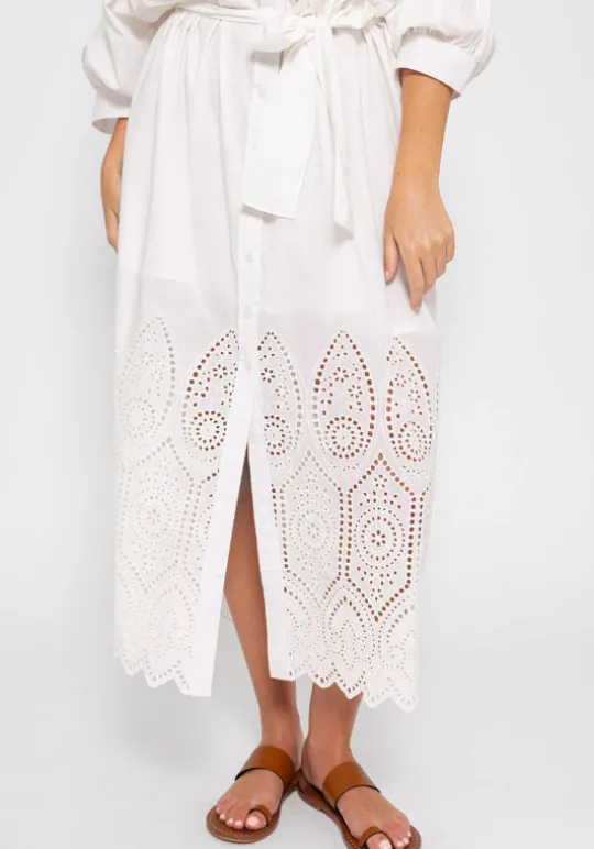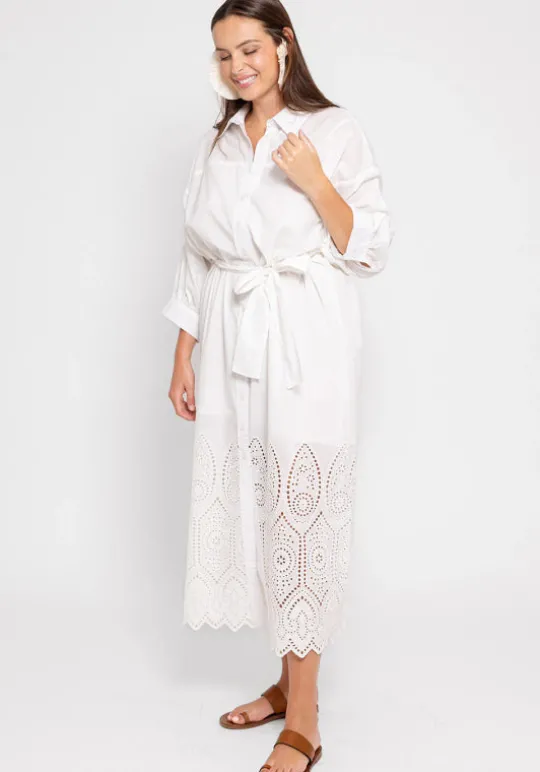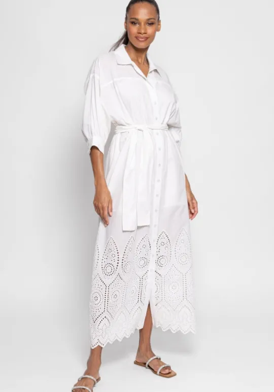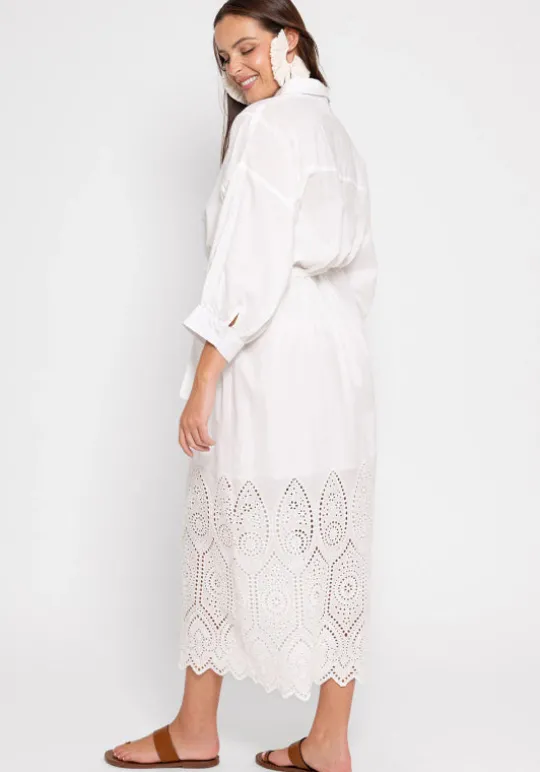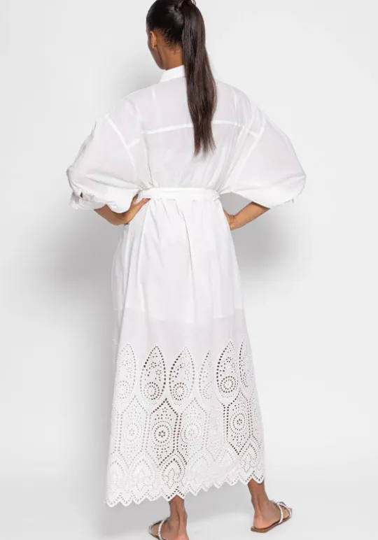 Floflo Beach Dress by the designer Sundress is a maxi shirtdress made with 100% cotton in white. The skirt features delicate patterns created with eyelet and a buttonhole runs along the dress. Model wears M/L and she is 178 cm/ 5’10”.