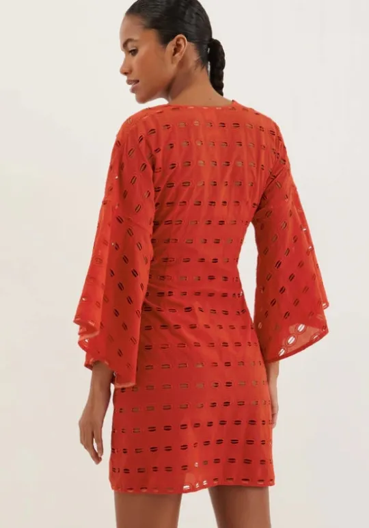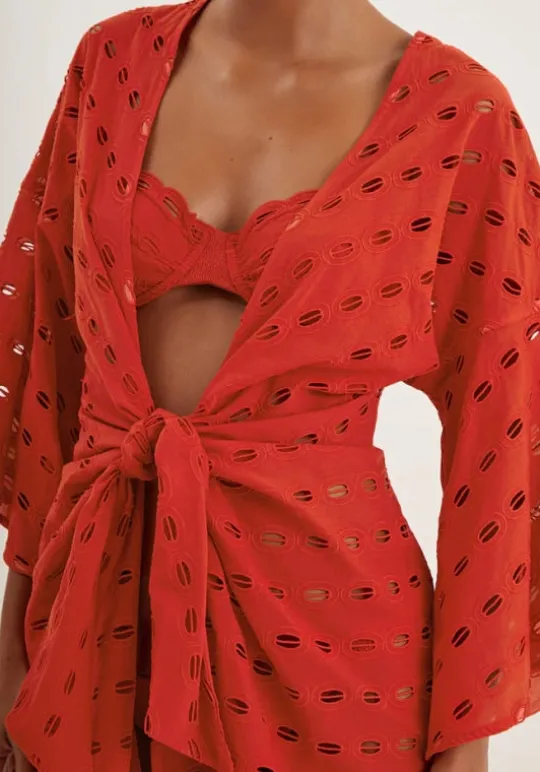 Elevate your poolside look with the Perola Beach Kaftan in Ruby by swimwear designer Vix. This must have beach cover up features a tie waist and wide fluted sleeves to create an elegant silhouette. Layer it over the matchingEyelet Naya Triangle Bikinifor an effortlessly chic beach look.