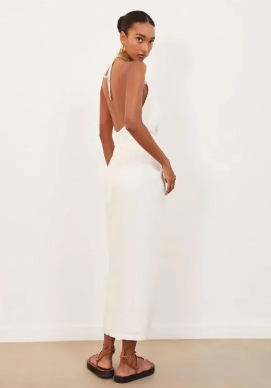 The Kana Midi Dress in Off White by beachwear designer Vix can elevate your summer wardrobe! With this elegant halter-neck midi beach dress featuring an adjustable tie neck, a knotted detail at the waist, and a front slit. Look effortlessly chic in this gorgeous dress this summer! 55% Linen 45% Viscose