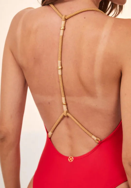 Be bold with the Layla Swimsuit Red Poppy by swimwear designer ViX. This unique on piece features an elastic rope in beige embroidered with waxed thread and small gold metal accents crossing at the back.