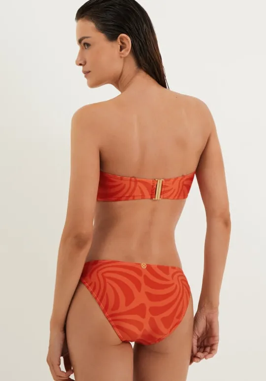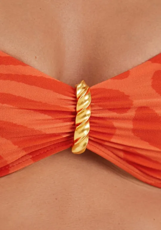 Effortlessly transition from the beach to the pool in the ViX Lori Bandeau Bikini Cherie. Its striking gold-plated bar detail at the bust creates a captivating statement while the magnetic clasp closure at the back adds both elegance and ease. With removable padding and full lining, this bikini is perfect for a vacation-ready look.